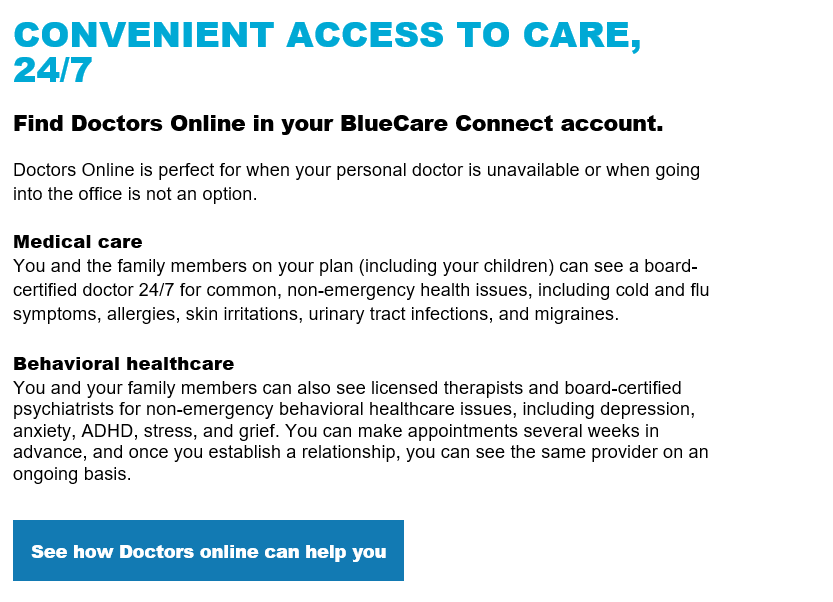 If your BCBSRI health plan includes Doctors Online, encourage your employees to find - and use - Doctors Online in their BlueCare Connect accounts.